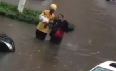 00后外卖小哥过膝深水中扶老人过街:助人更重要